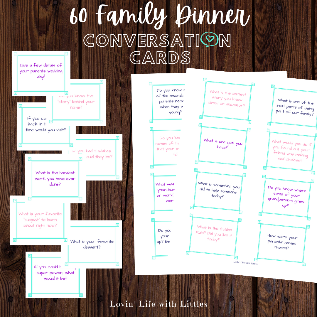 These 60 Family Dinner Conversation Cards will spark fun and meaningful discussions in your home. These questions will get the kids sharing memories, goals, and feelings. They provide opportunities to affirm kind choices and tell family stories.