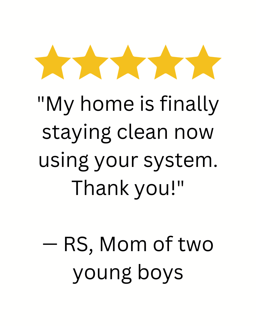 - Recordings of the 5 Training Videos that walk you step-by-step through creating a cleaning system that actually works to keep the house clean in less time