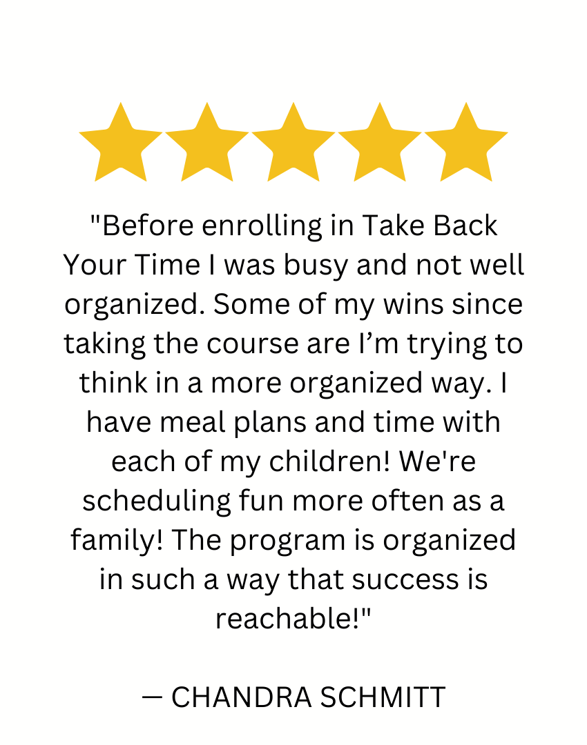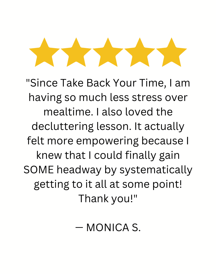 Take Back Your Time is our signature program that teaches step by step with videos and workbooks how to move from stressed out to joyful in your home systems.